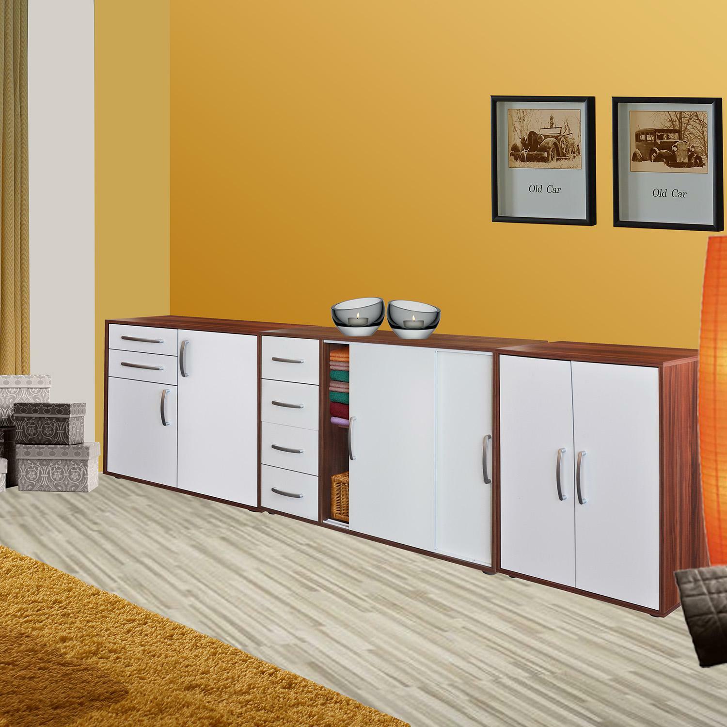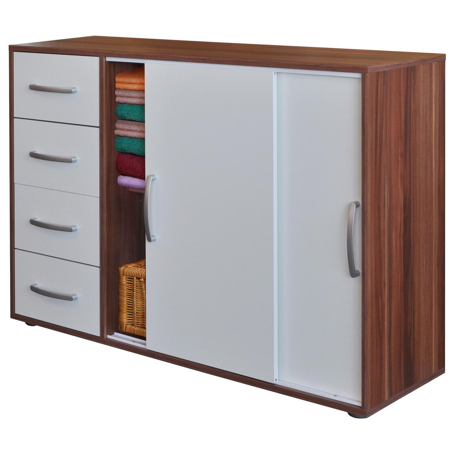 barevné provedení ořech / bílá 2 posuvná dvířka, 1 variabilní police 4 zásuvky, hloubka zásuvky 30 cm