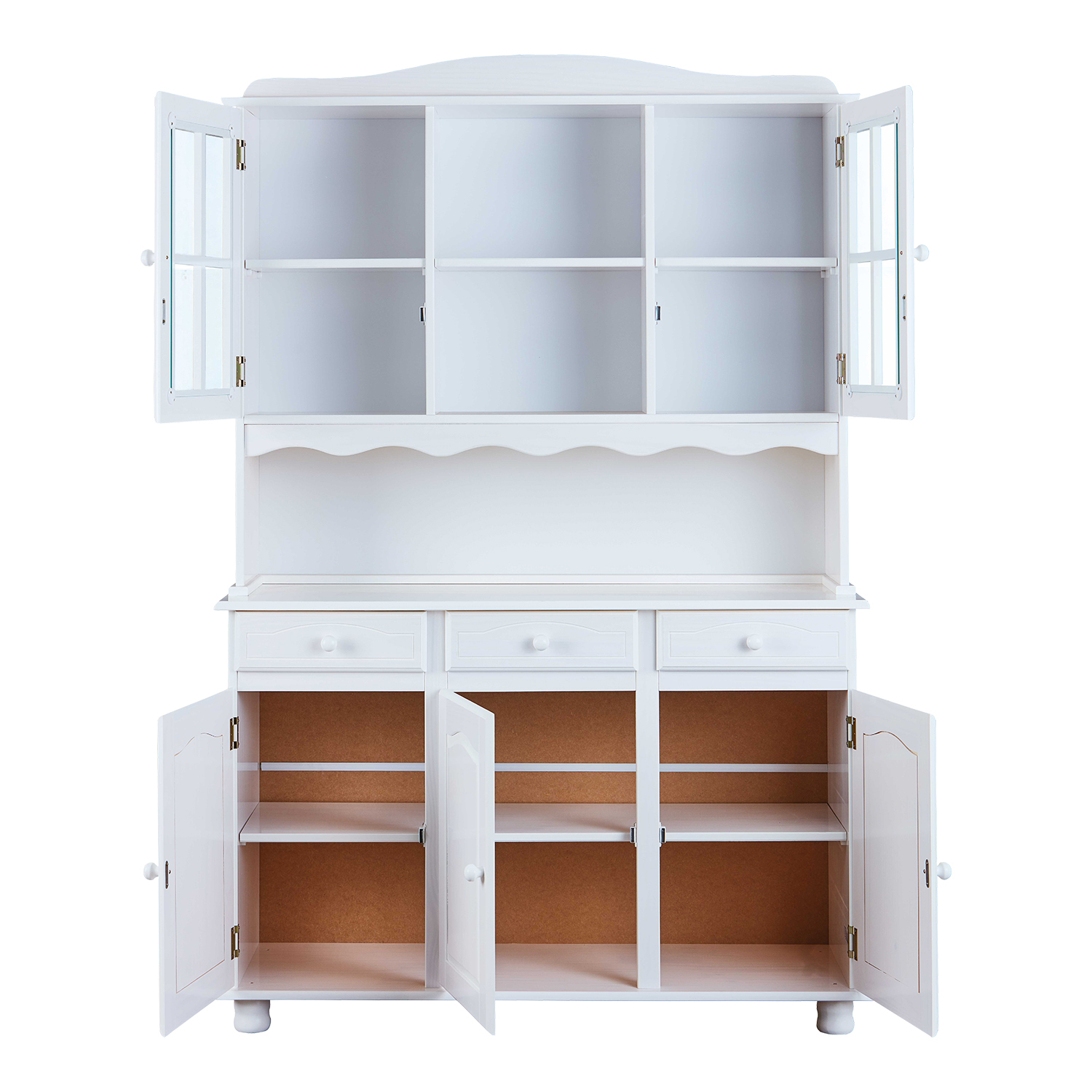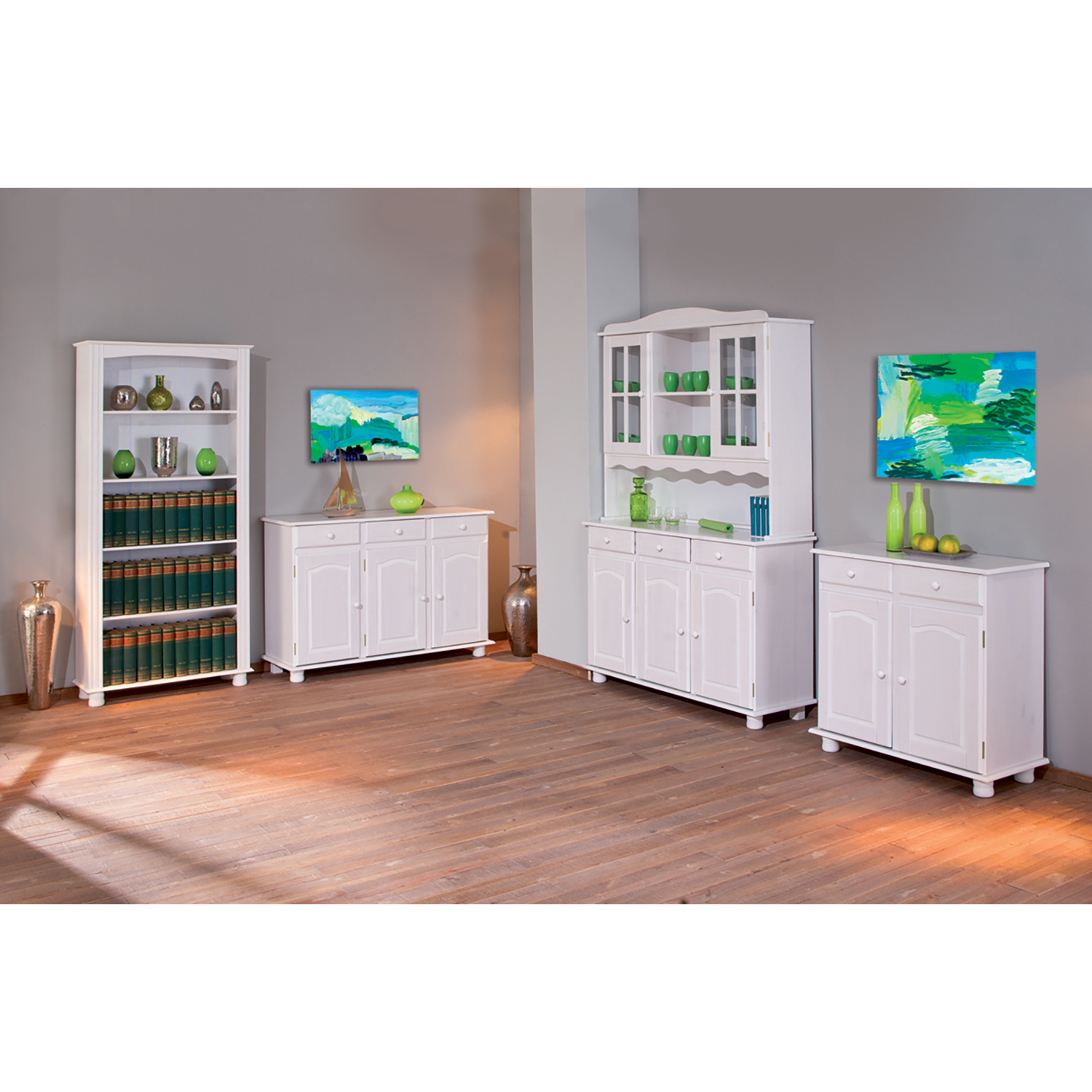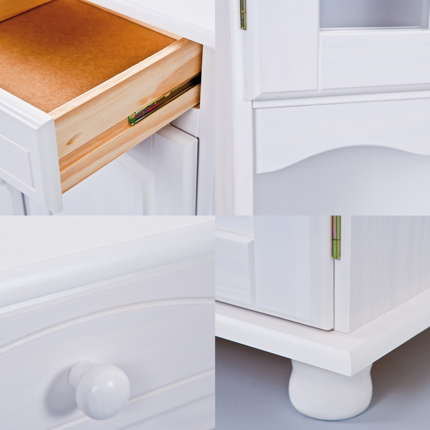 materiál masiv borovice, barevné provedení bílý lak v horní části 2 prosklená dvířka, 2 police ve spodní části 3 plná dvířka, 3 zásuvky s kovovými pojezdy hloubka horní části 32 cm sestava příborníku LIVIO ID20900810 a nástavce LIVIO 8057B PAMINA, LOVI, ABACO, LIVIO, ALICANTE, VALENCIA, TOSCANA, SIENA