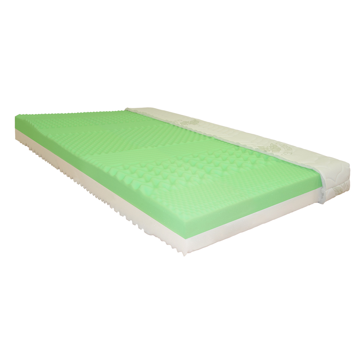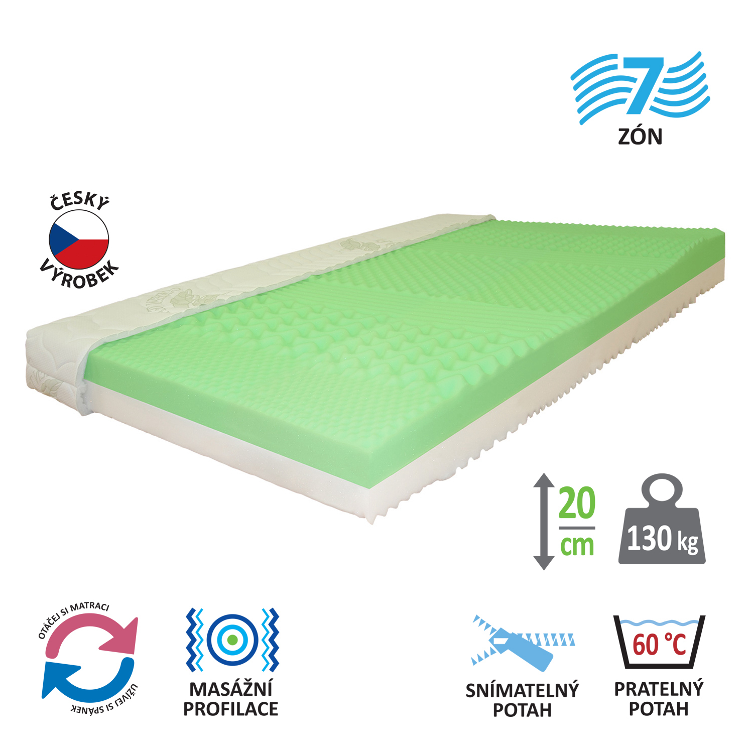 masážní profily s různou pevností stran, jádro z Flexifoam pěny povrch je vyprofilován do 7 anatomických zón na obou stranách tvrdá (bílá) a měkká (světle zelená) strana vhodná pro všechny typy roštů vhodná pro alergiky, potah snímatelný a pratelný do 60 °C doporučená nosnost do 130 kg