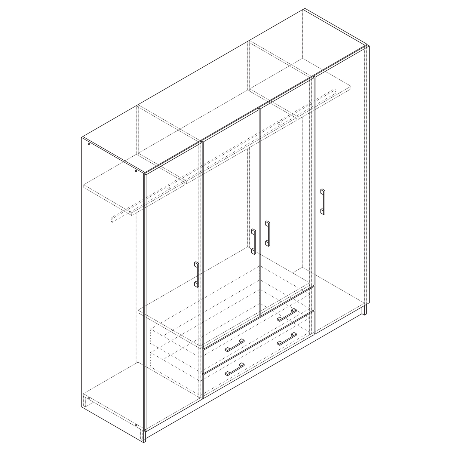 barevné provedení bílá 2 zrcadlové a 2 plné dveře, prostor dělený v poměru 1:2:1 ve všech třech částech šatní tyč a police, ve střední časti dole 2 zásuvky možno doplnit o nástavec 21545