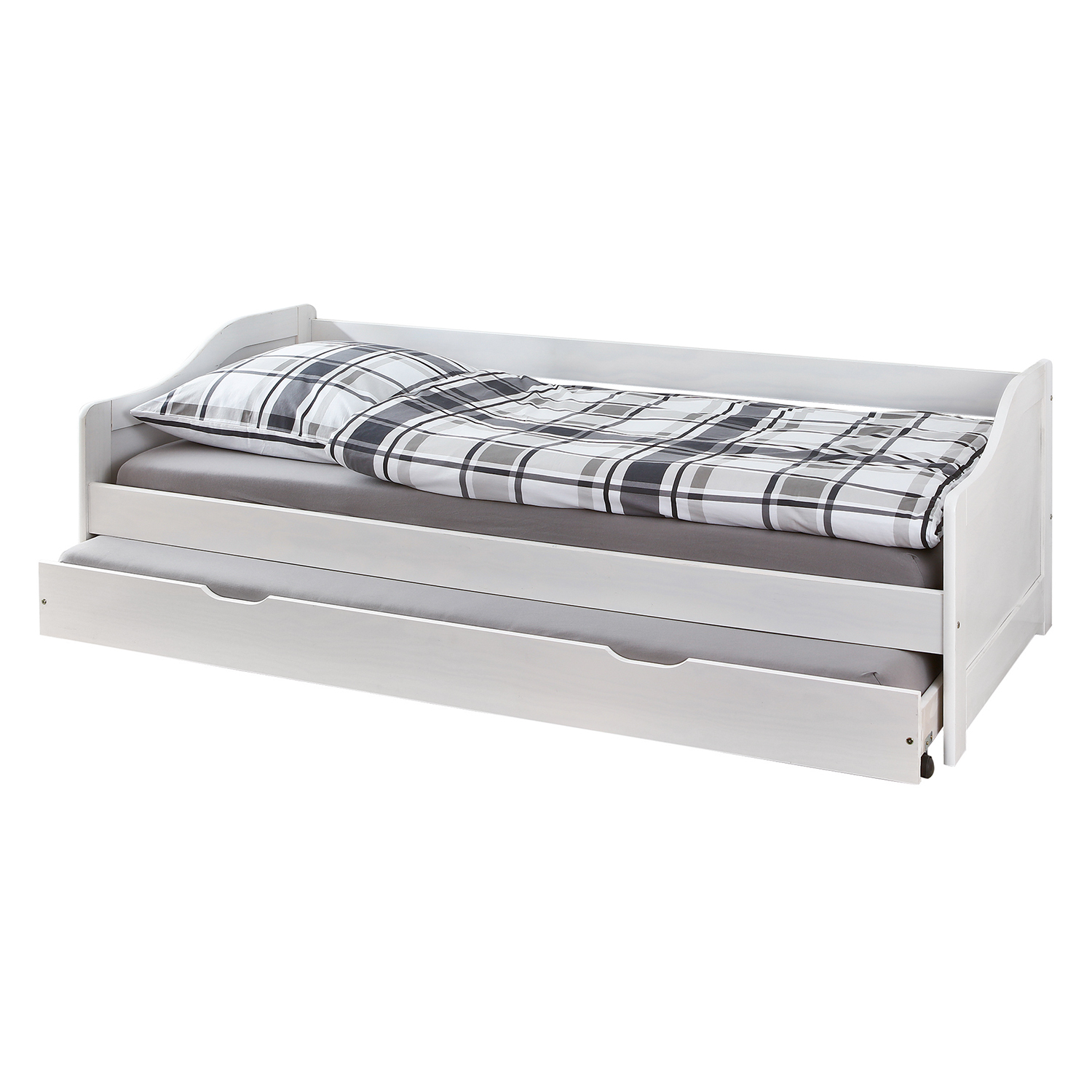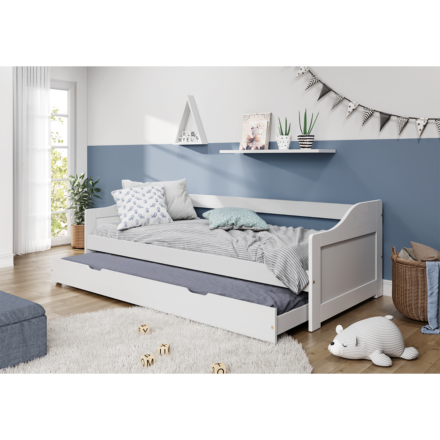 materiál masiv borovice, barevné provedení bílý lak výška sedu postele 37 cm dřevěné laťkové rošty jsou v ceně, matrace nejsou v ceně výsuv možno využít jako úložný prostor nebo jako přistýlku doporučená výška matrace pro přistýlku 10 cm doporučený rozměr matrací 90 × 200 cm Leonie ID20900215